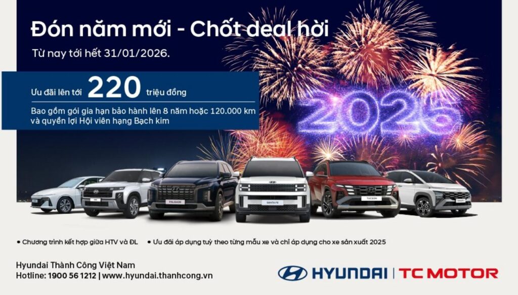 Cần Thơ, Tháng 1/2026 – Nhằm mang đến khởi đầu năm mới đầy hứng khởi và hỗ trợ khách hàng chuẩn bị cho Tết Nguyên đán, Đại lý Hyundai Cần Thơ chính thức công bố chương trình ưu đãi đặc biệt “Đón năm mới – Chốt deal hời” trong tháng 1/2026. Với tổng giá trị khuyến mãi ấn tượng lên đến 220 triệu đồng và chính sách bảo hành đột phá 8 năm, Đại lý Hyundai Cần Thơ cam kết mang lại sự an tâm tối đa cùng cơ hội sở hữu xe hấp dẫn cho mọi gia đình.